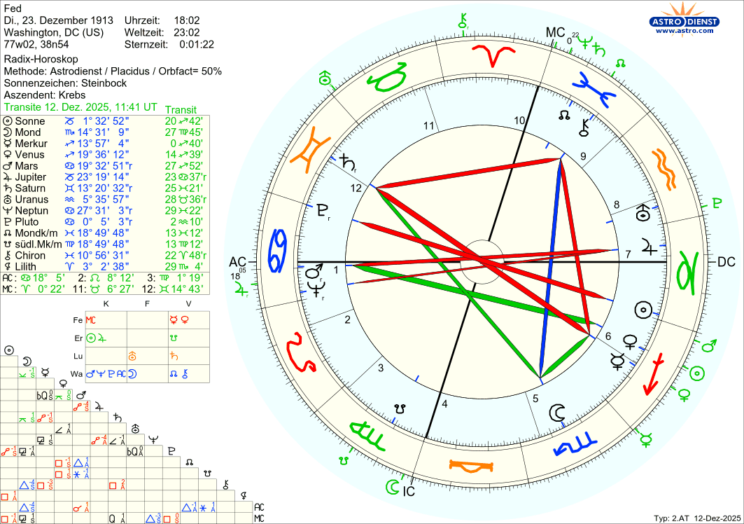 Damit ist dieser Krieg exakt 112 Jahre später nach Gründung der FED am 23. Dezember 1913 auf der Ebene angekommen, an dem er begann und vermutlich auch entschieden wird. Die Gründung der FED war aus astrologischer Sicht eine verborgene Kriegserklärung an die gesamte Weltbevölkerung (=Mars als Hr10 am AC im Krebs und Neptun ebenfalls als Hr10 in Hs1). Gottseidank haben bereits viele Nationen – und es sind die größten auf dieser Erde unter ihnen – seit einiger Zeit die wichtigsten Strukturen ihres gemeinsamen Feindes erkannt. Das weltweite Finanzsystem, das Wirken des Tiefen Staates in ihrem Inneren und der NGOs von Außen.