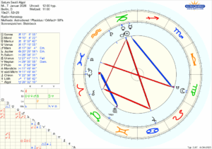 Dieser muss scheitern. Denn Uranus-Algol-Konjunktion wird nicht mehr exakt, sondern Uranus nähert sich am 7.1.26 in seiner Rücklaufphase an Algol nur bis auf ca. ein Grad. Sämtliche anderen Planeten sind zu diesem Zeitpunkt bis auf Jupiter wieder direkt läufig. Die Stellung des Mondes am abst. MK im Trigon zum Stellium weist darauf hin, dass ein harmonischer Übergang von der bisherigen Anpassung an die alte UNOrdnung zur neuen multipolaren Weltordnung stattfinden wird.