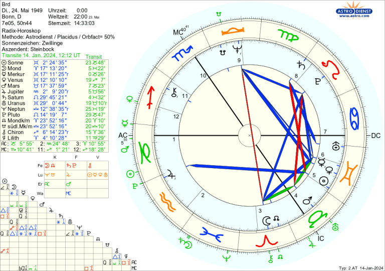 Mit dem Eintritt von Pluto in den Wassermann und der zunehmenden Konjunktion mit Jupiter, trägt diese Konstellation das Potential in sich, das ein grundsätzlicher Systemwechsel stattfinden kann. Pluto sorgt gerade durch seine Wiederkehr im Radix der USA für deren zunehmenden weltweiten Machtzerfall und gleichzeitig werden in der BRD die Stimmen immer lauter und mehr, die auf deutschen Boden und in unserer Heimat die Unabhängigkeit einfordern (= Uranus als Hr2 tr Hs4 im Stier). Es waren zuerst nur die Bauern, die gegen die unzumutbaren Steuererhöhungen und die gleichzeitig vorhandenen enormen Abflüsse ins Ausland demonstrierten. Mittlerweile haben diese einen breiten Rückhalt in der Bevölkerung erhalten. Um den unaufhaltsamen Machtverlust der USA zu verzögern, soll die BRD wie üblich immer noch mehr ausgepresst werden. Die Aufgabe der Deutschen (= aufst. Mondknoten Hs3 im Widder und Transit des MK) ist es die Stimme zu erheben, damit die erwirtschafteten Ressourcen wieder im eigenem Lande bleiben (= Mond im Widder mit Mars als HR3 nach Hs4 in con mit Uranus im Stier).