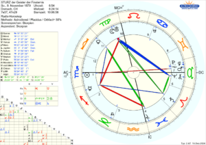 Erstellt man zu diesem Tag das Sonnenaufgangsradix tritt das Wesentliche zu Tage. Der AC im Skorpion symbolisiert den entschlossenen Kampf einer machtvollen Wesenheit (=Sonne als Hr10 am AC), die das Ziel verfolgt, dem bisherigen Wirken der Widerstandskräften entgegen zu treten (=Pluto als Hr1 in Hs7 con Mars als Hr von Hs5/6). Diese wurden von ihm zurück gewiesen (= Sa im Widder) und in die materielle Heimat zurück geschickt, von der sie gekommen waren (=Algol im Stier). Somit war die Ordnung in den geistigen Sphären wieder hergestellt.